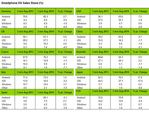 Наибольший прирост идет в Италии - 14,4% и Великобритании - 10,3%, а также Польше и Финляндии. Основная тенденция такова, что разница между iOsи WP всего 4,4% и WP продолжает медленно сокращать этот разрыв. Какими будут успехи в свете вышедших iPhone 6 и iPhone 6 Plus остается гадать. Microsoft пока не выпустил достойного конкурента-новинку и погряз в дрязгах с Nokia.